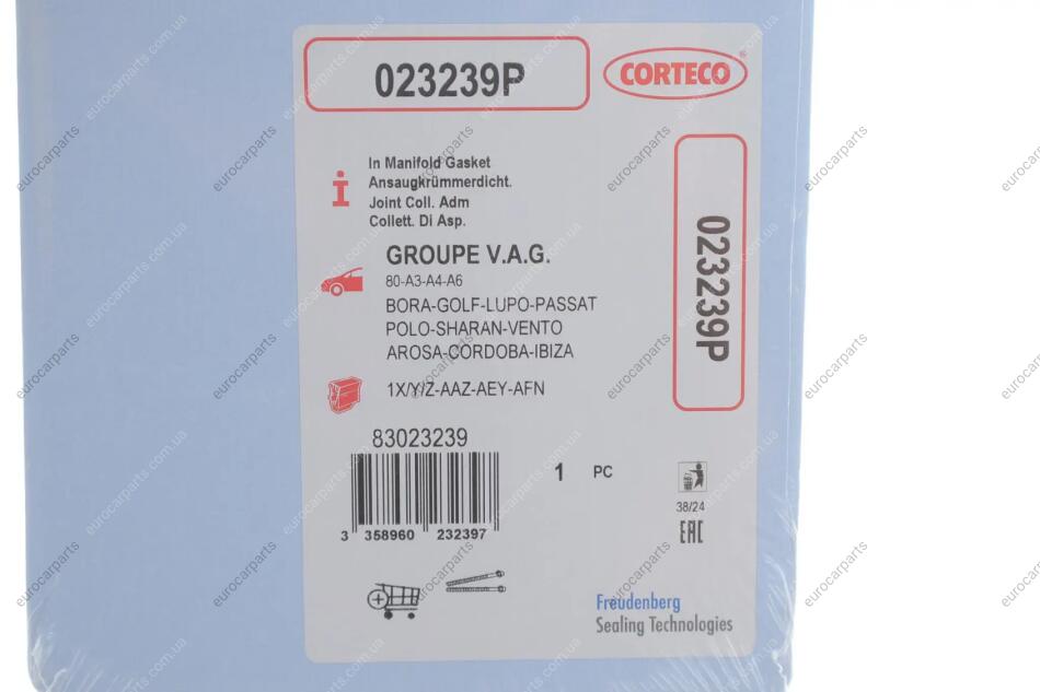 Прокладка колектора впускного VW T4/T5/Caddy 1.9TDI Audi 80, Volkswagen Passat, Transporter, Golf, Vento, Seat Toledo, Ibiza, Audi A6, Seat Cordoba, Audi A4, Volkswagen Polo CORTECO 023239P
