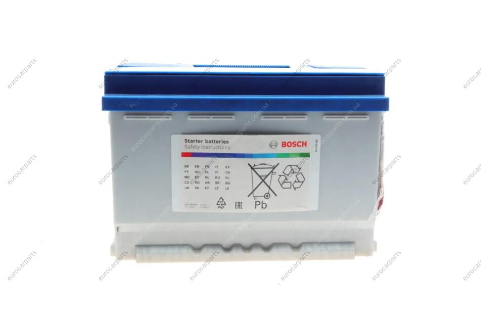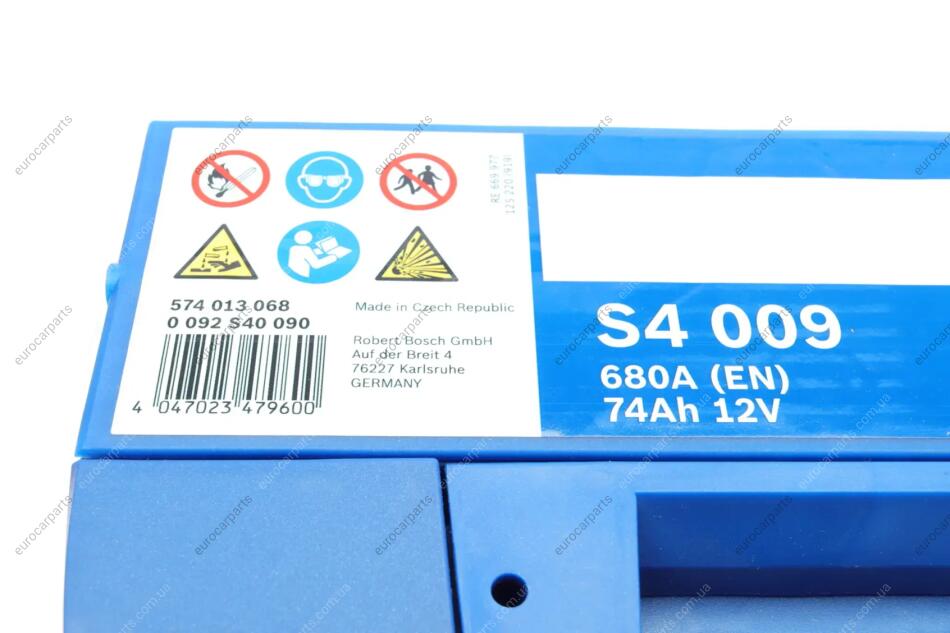 Акумулятор 12В 74Агод./680А S4 (L+ стандартні клеми) 278x175x190 B03 - монтажний фланець 10.5мм (пусковий) Fiat Ducato, Jeep Wrangler, Cherokee, Chrysler Voyager, Nissan Terrano, Hyundai H-1, Jeep Grand Cherokee, Ford Explorer, Chevrolet Captiva, Dodge Caliber, Jeep Patriot BOSCH 0 092 S40 090
