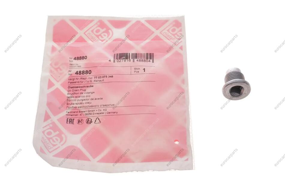 Болт зливу оливи Renault Trafic 01- (M16x1.5) Renault Megane, Volvo 480, Renault Kangoo, Dacia Logan, Renault Fluence, Twingo, Dacia Duster, Renault Clio, Volvo S40, V40, Renault Scenic FEBI BILSTEIN 48880
