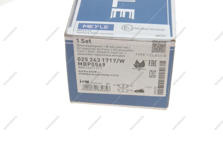 Колодки гальмівні (передні) Kia Rio/Hyundai Accent 05- Hyundai IX20, I20, KIA Rio, Hyundai Accent MEYLE 025 243 1717/W